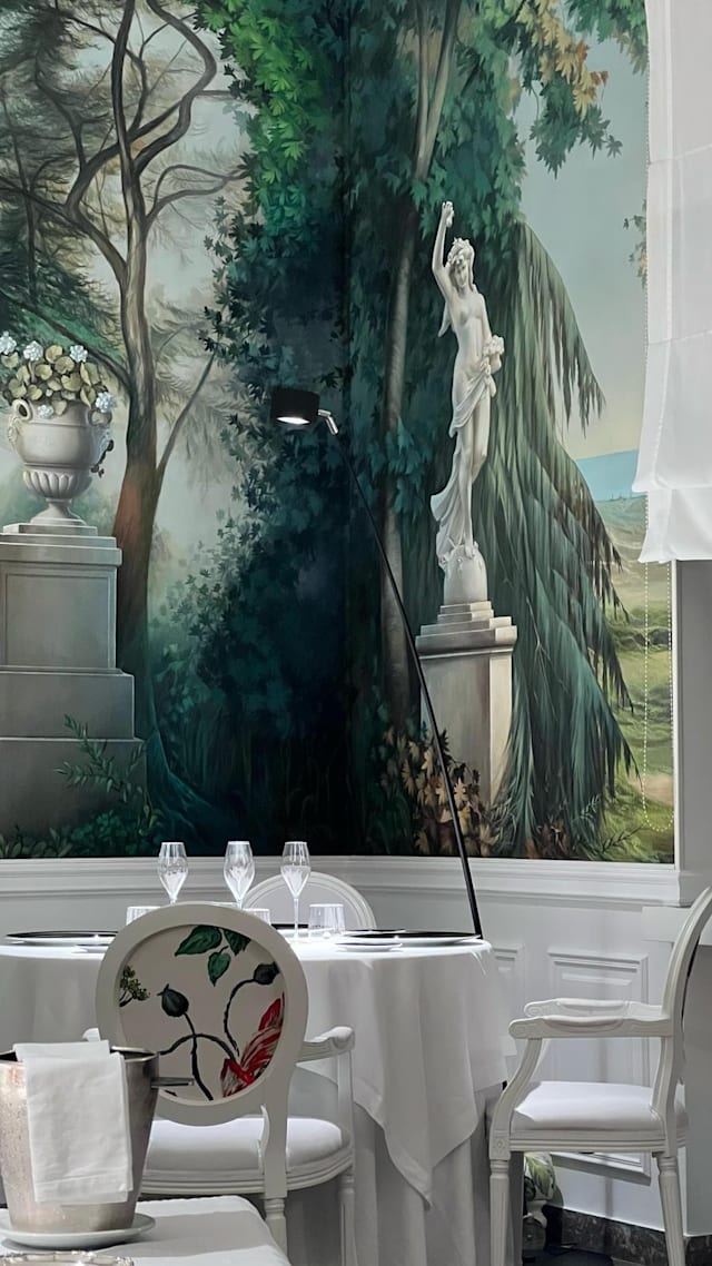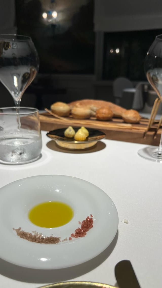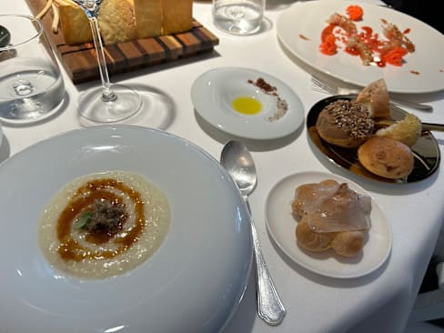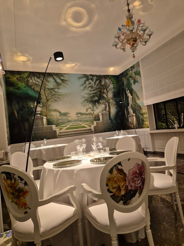 10/10The restaurant has just 5 tables with an elegant atmosphere. The room is painted with a beautiful mural and is complimented by Valencian lighting, overlooking a well manicured garden. The waitstaff/sommelier are warm and welcoming, and their attention to detail underscore the well-earned Michelin star. We ordered the Tera and 6 course menus. The homemade olive oil paired with salts from around the world and the assortment of bread is a unique touch. The cuisine presentation from start to finish is impeccable, and the pairing of flavors is divine! This was a first-class experience that will live in our family's memories for years to come! Bravo to the chef and his well-appointed staff!
