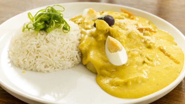Cuisado de pollo con base de aji amarillo y pan acompañados de patatas cocidas y arroz blanco.