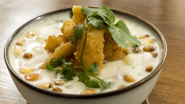 Trozos de corvina con leche de tigre de aj limo. acompañadas de chicharrón de calamar choclo Y cancha.