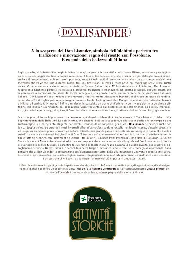 10/10Highly recommended for anyone wanting a refined and delicious taste of Milan in a truly elegant setting. Dining at Don Lisander was an unforgettable experience. Located in the heart of Milan. A five-star experience from start to finish! The service was outstanding – professional, friendly, and genuinely attentive without being intrusive. The wine list is also impressive, with an excellent selection of Italian labels that pair perfectly with the menu.