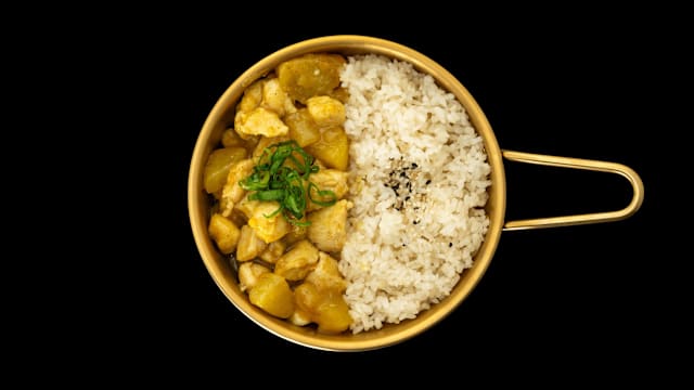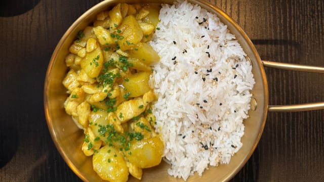 Riso bianco accompagnato da un delizioso curry con pollo e patate