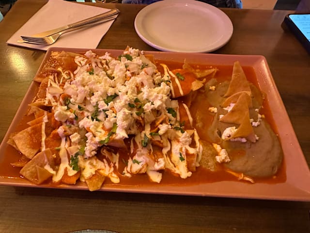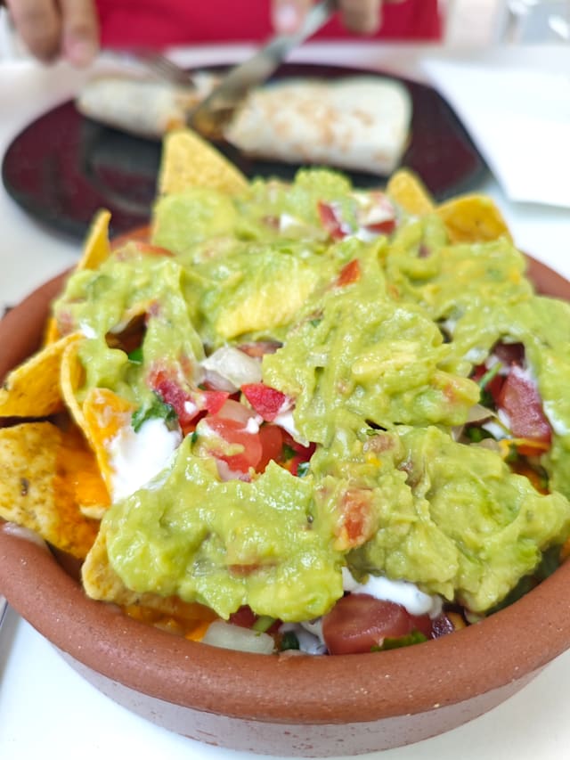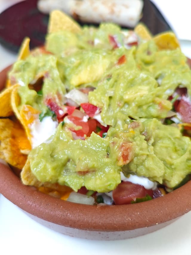 Totopos, se sirven con guacamole, cheddar, mozzarella, pico de gallo, crema agria, una carne a elegir y frijoles