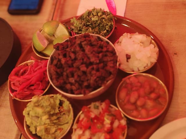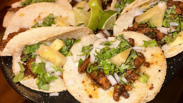 2 unidades. Base de frijoles refritos, pastor, arrachera, chorizo, cebolla y cilantro, tortilla de maiz artesanal