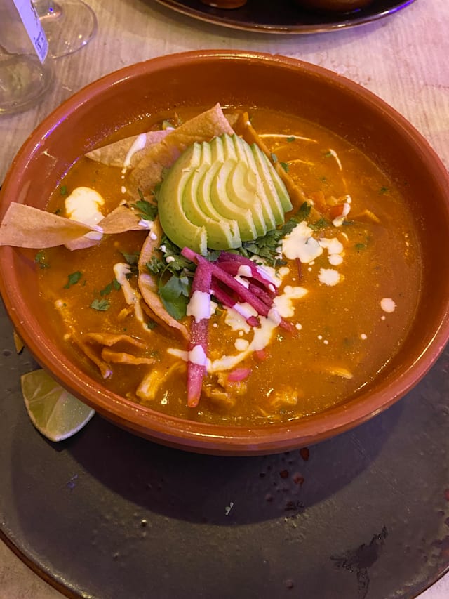 Sopa a base de caldo de pollo, especias , tortillas de maíz frita pollo, crema agria, queso, aguacate.