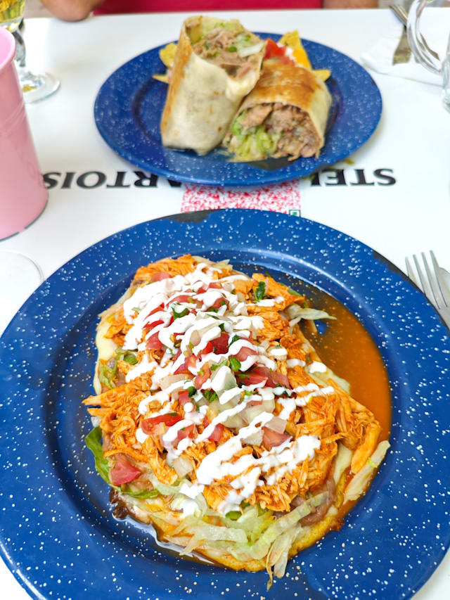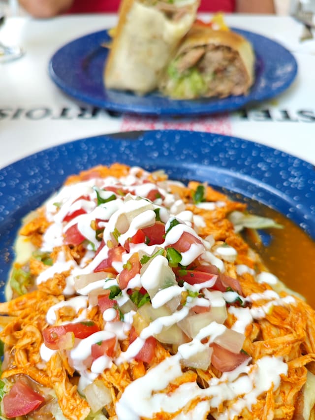Masa de maíz casera artesanal de forma oval. Se sirve con frijoles, queso mozarella, una carne a elegir, lechuga, pico de gallo, crema agria, queso fresco y guacamole