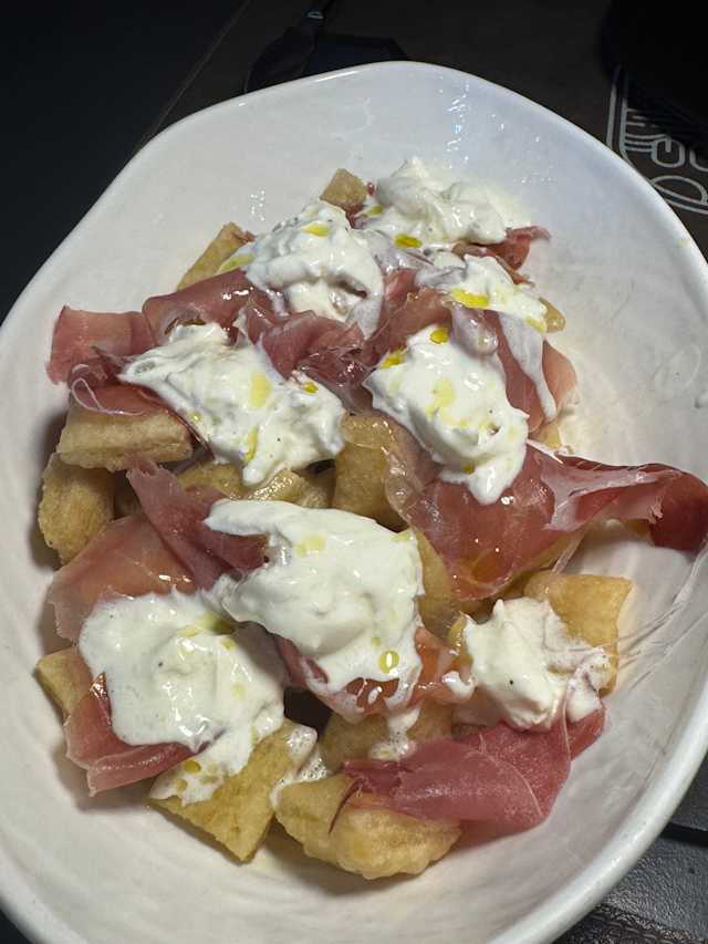 - Straccetti di pizza fritti, stracciatella di bufala, prosciutto crudo, olio evo, sale, basilico