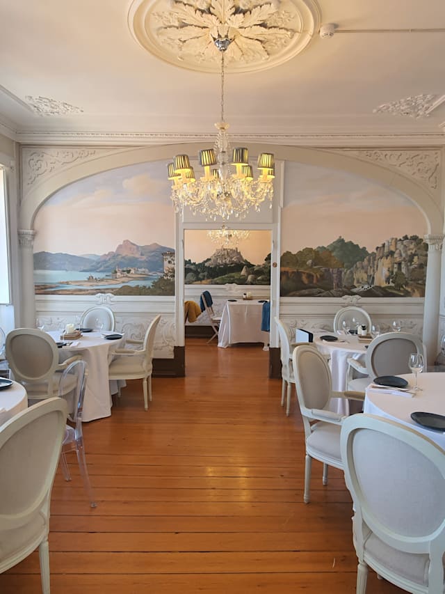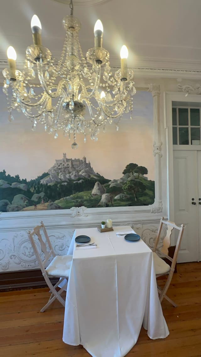 10/10One would never imagine what lies behind the iron gate and then the door of inconspicuous building in Sintra. A one-of-a-kind restaurant, with walls painted with bucolic scenes it has a nostalgic, yet modern, atmosphere. The three rooms offer comfortable seats and generous tables set with tablecloths. The view towards the Palácio da Vila and Sintra's rooftops is an added bonus, making this a wonderful place to have a serene lunch ou dinner. Food was faultless. The Game Sausage Croquettes with a Mustard and Honey Dip starter were very good, although I consider the dip could have a stronger, more pungent, taste. The Shrimp, Clam and Mussel Rice, was delicious, as was the Dona Maria Cod, which had an interesting aroma that I couldn't quite pinpoint. We paired the food with Terras de Uva red wine. Service was irreproachable.