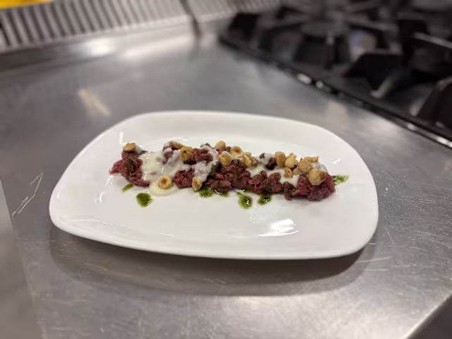 - Battuta di vitello con scaglie di grana e pomodorini