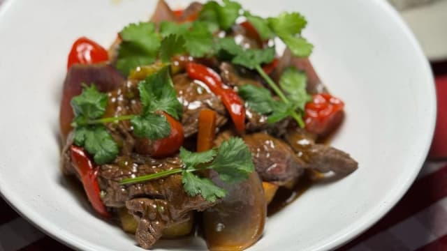 Tripes de bœuf cuites avec beurre de cacahuete pomme de terre, huile de rocou, dignon ,poivron vert lait, garniture riz euf au plat, avocat , banane plantain