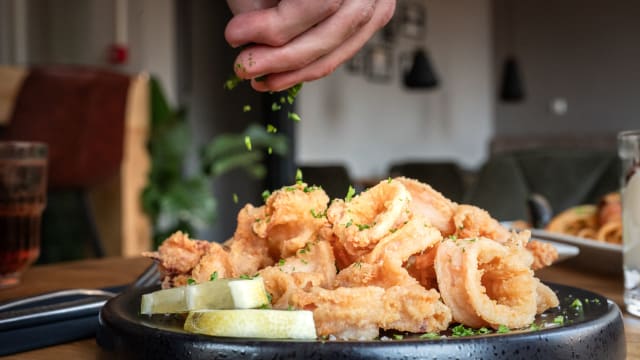 Vers gefrituurde calamaris en garnalen naar traditioneel recept uit zuid italië