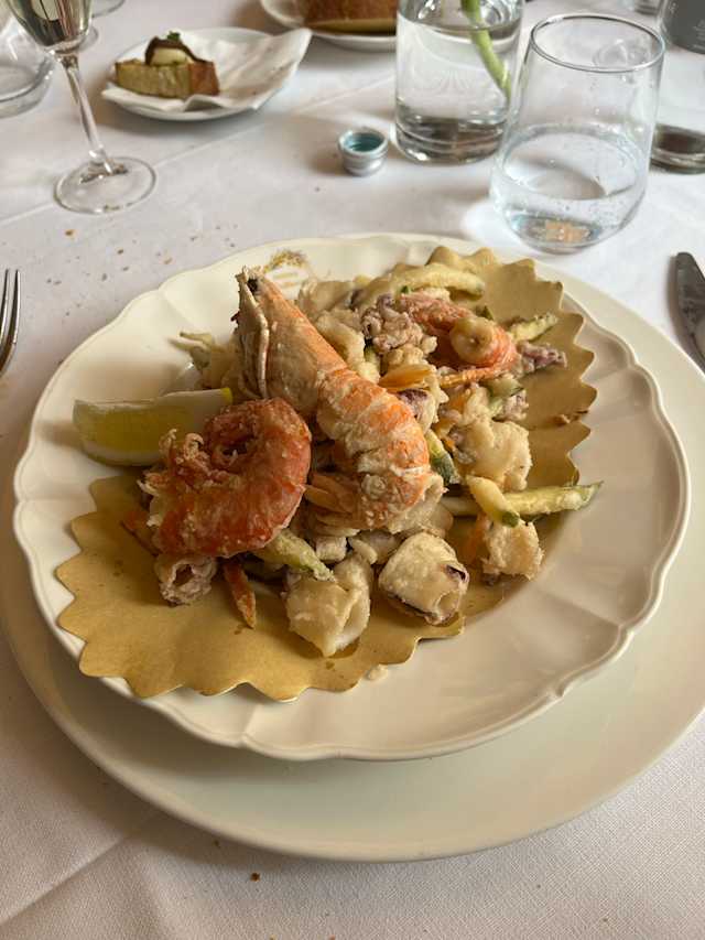 - Insalatina tiepida di mare con seppie, cozze, vongole, polpo e gamberi lessi accompagnati da zucchine e carote, condite con vinaigrette