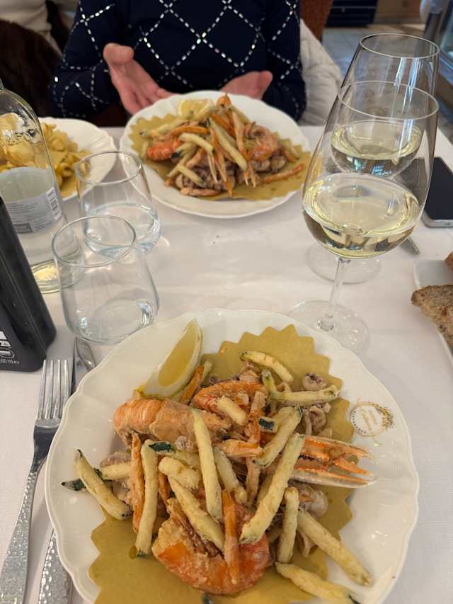 - Fritto misto di pesce: anelli e ciuffi di calamari, mazzancolle, scampo, zucchine e carote