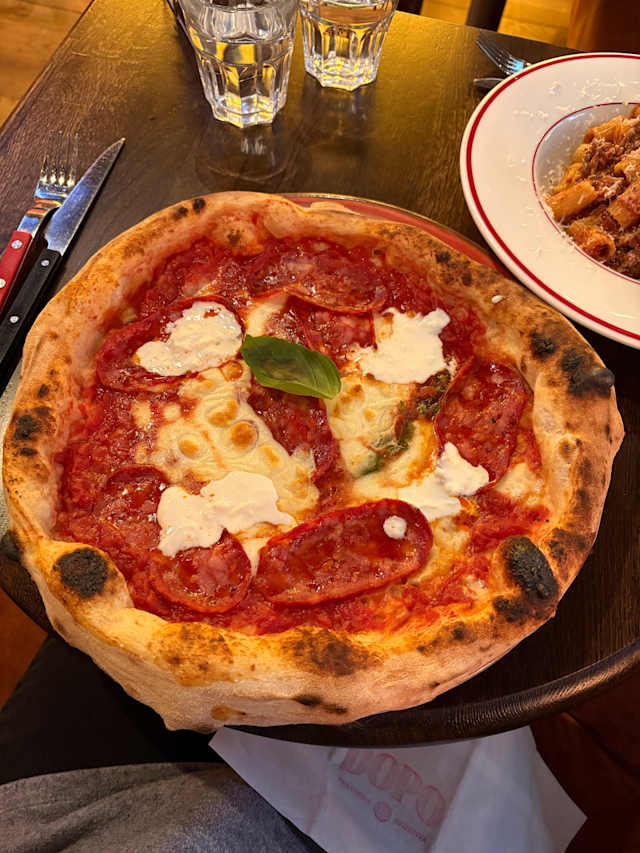 Sauce tomate san marzano, mozzarella fior di latte, stracciatella, salsiccia piccante