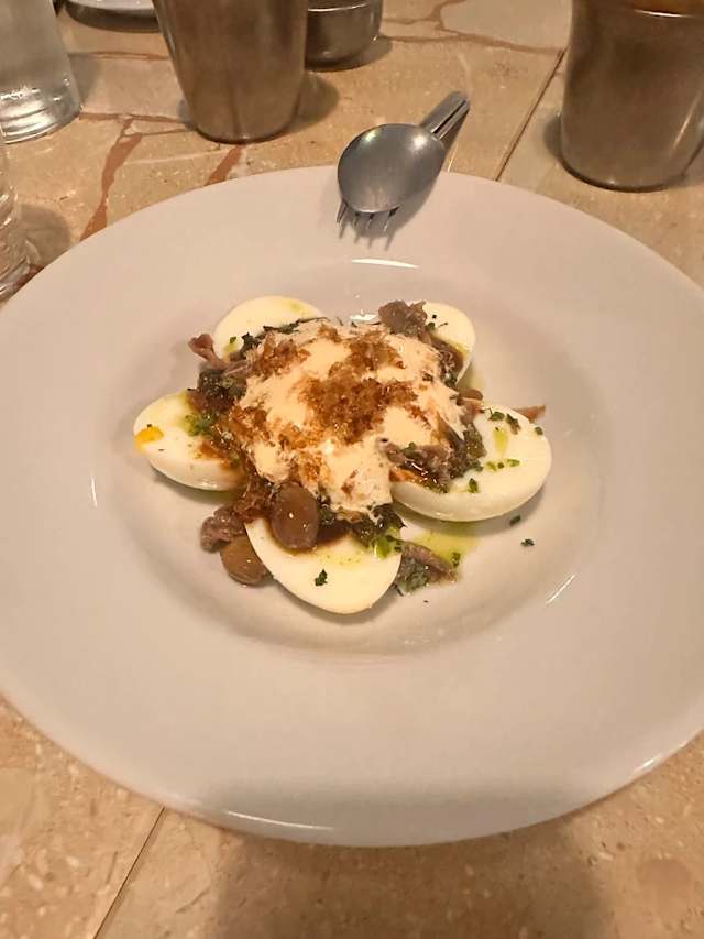 - Vitello cotto a bassa temperatura, salsa tonnata, katsuobushi, jus di vitello