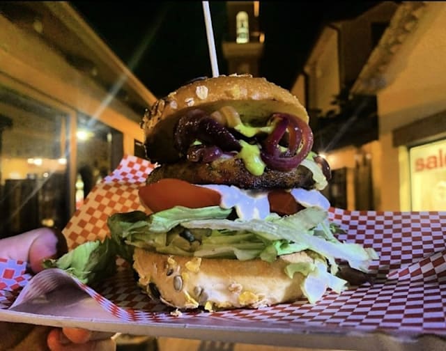 - Beyond burger vegano (vedi descrizione), insalata, pomodoro, salsaguacamole, cipolla caramellate, mayo.