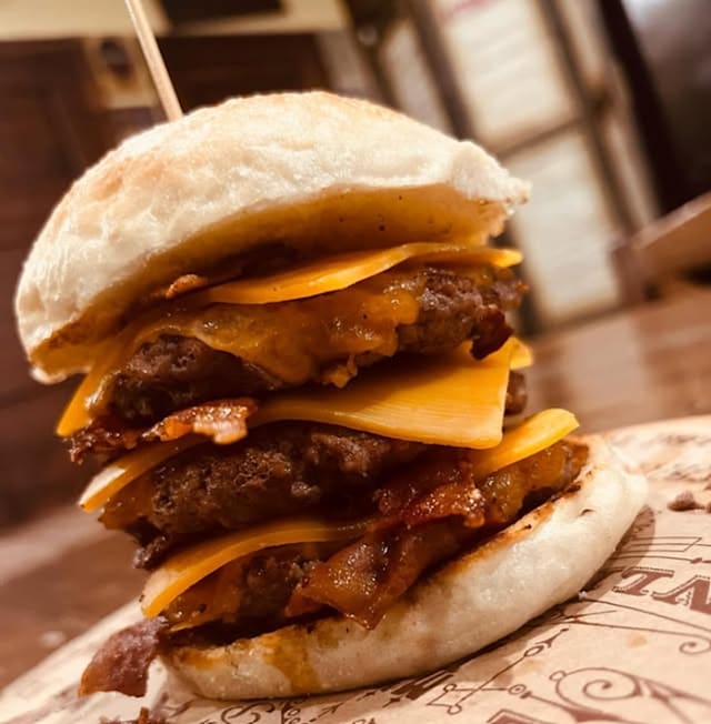 - Burger di manzo da 200 grammi, stracciatella di burrata, funghi, scamorza affumicata che si strugge