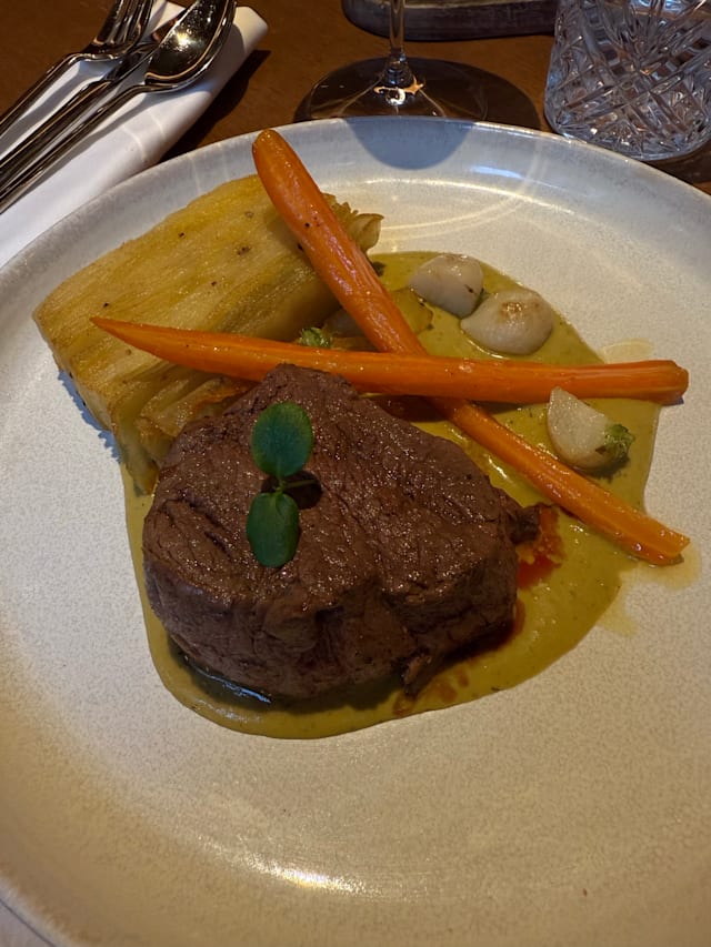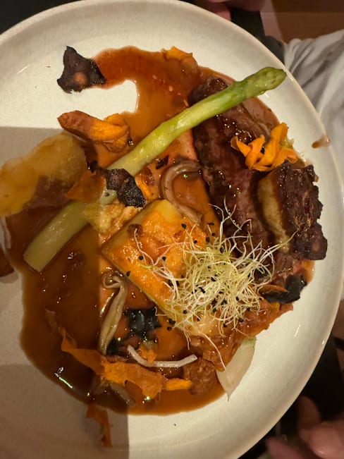 9/10Not very many people in the restaurant, so we had extra special service. Entree was lukewarm, but delicious nonetheless, the pluma was rather tough, it would be good if staff asked at order time if there are allergies (one of our guests do not digest red pepper (poivron) well, hence had an "oh no!" moment, but all was good once all ther pepper was pushed aside. The restaurant did generously offer to bring another plate without the pepper, which we politely declined as we were on a strict schedule. Manager was kind enough to be completely transparent about issues in the kitchen (fridge holding the particular dessert we ordered broke down, so he preferred to say pls choose another dessert on the house, which was appreciated)!
