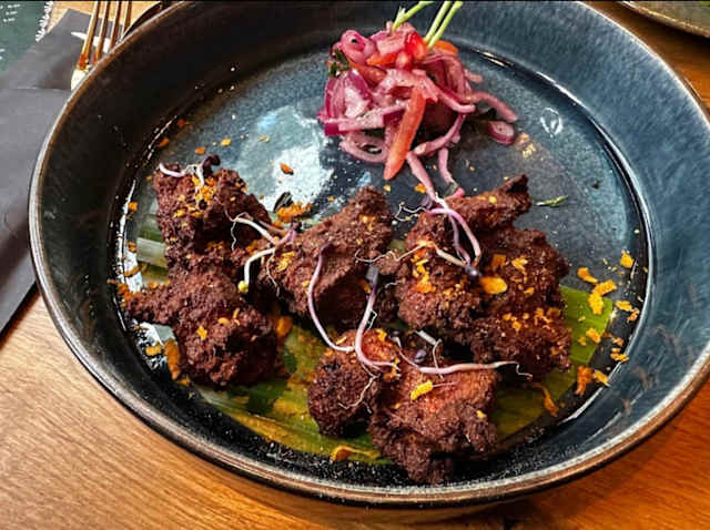 Juicy prawns are slow-cooked in a velvety coconut milk sauce, enriched with tangy raw mango and kerala's signature blend of spices and herbs.