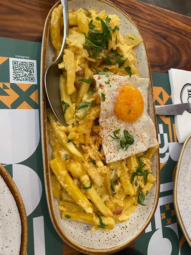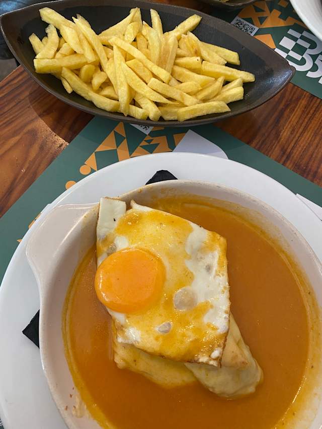 - Hambúrguer de alheira de caça com pêra, bouquet de rúcula, ovo estrelado e batata frita