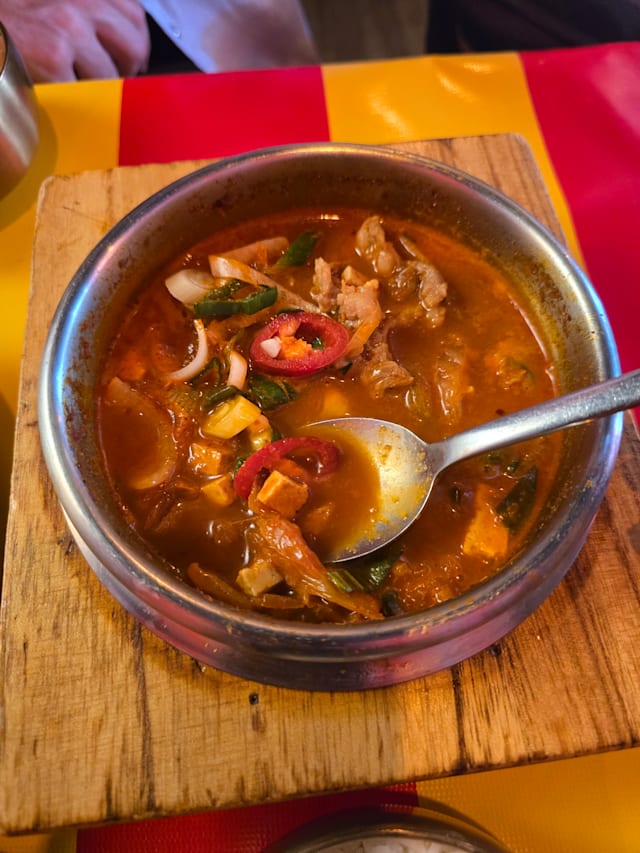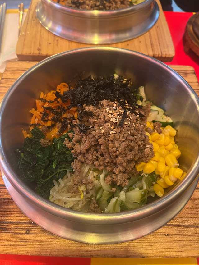 7/10We loved the food last time so we were so looking forward to trying new dishes and also to get the same we loved. The corn dog was not available and the explanation was because the chef was busy ???? the soondubu jjigae was great as last time but the rose ttukbokki was very watery and no taste as if someone else cooked this dish. The Pajeon was burnt but ironically not crispy. We had dakgalbi and my son loved the spicy taste. I am Korean so I cooked the dakgalbi at the table but I would have loved someone assisted a bit even just to check the readiness of the meat or putt of courtesy. The waiting staff seems new and not trained enough to explain what consists of the sets. Overall, it seems like the consistency is missing here. The food tastes great one day and disappointing next day. The service level is only friendly but not efficient. The restaurant hall is small and the table is too small for Korean style to cook the meat with the table gas burner. I guess it’s a lot nicer in the summertime with the terrace open. I would go back with my Swiss friends to try more dishes to be fair. It’s a rare authentic Korean restaurant in Montreux and I wish this restaurant to last long with a great success so I can enjoy authentic Korean food here.