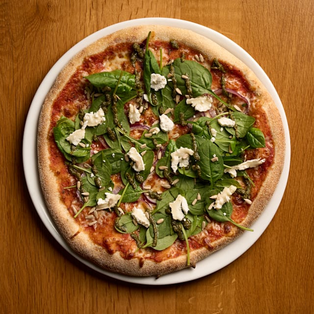 - Tomatensaus, mozzarella, verse spinazie, rode ui, geitenkaas, pesto, geroosterde zonnebloempitten