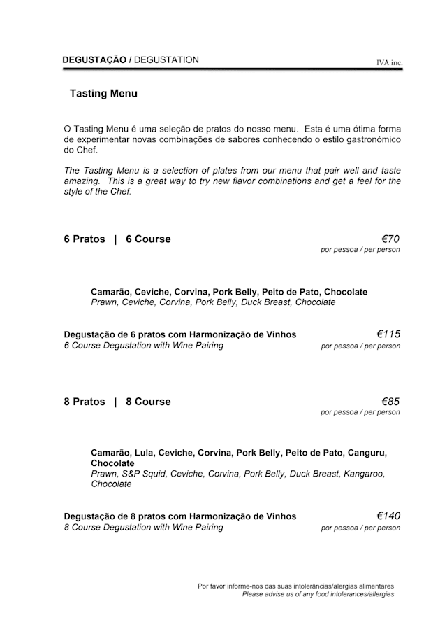 10/10This is a great restaurant with creative food. Kangaroo tartare with confit egg yolk. Fantastic. Delicious prawns with mango and lime sorbet, excellent pork belly. My description can’t do it justice, one of the best restaurants I’ve been to in Lisbon. Both me and my guest will go back. At the end Justin came out to chat as well. Well worth a visit