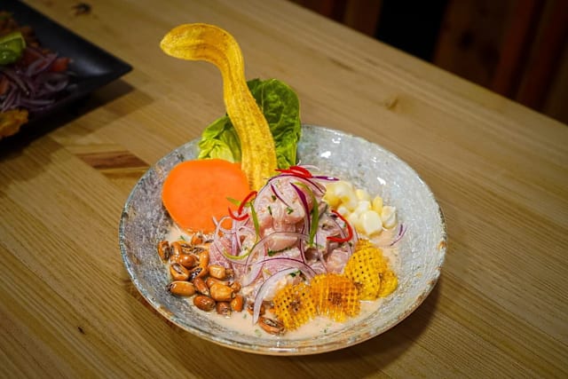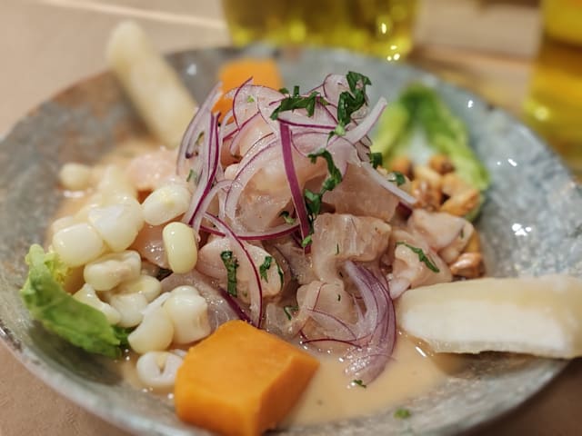 Fondo de ternera enriquecido con maíz mote, papa y hierbas aromáticas que despiertan los sentidos.