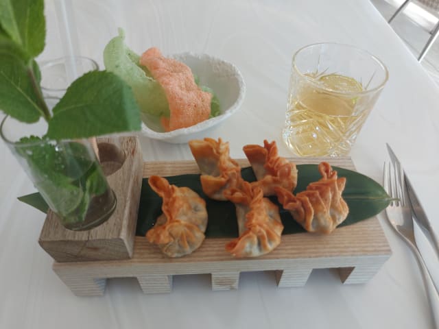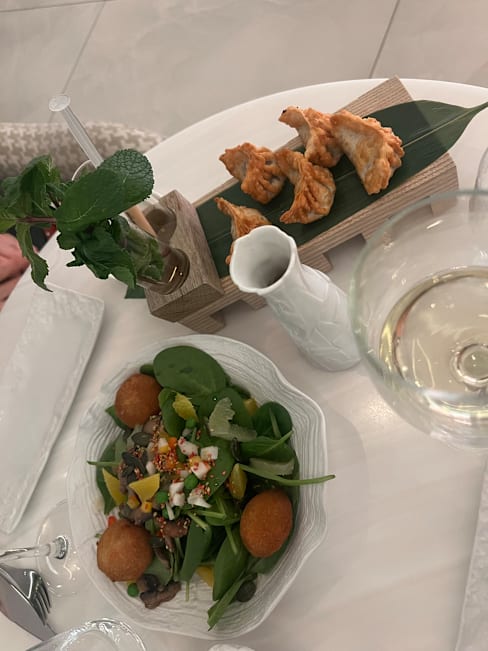6/10Service he was very kind but missed out on a few details. There was only one person to take care of tables. Wine by glass terrible, who knows how long the bottle had been open. Constant change of colours in lighting was a bit intrusive to the eyes. Food was ok. The mushroom gyozas were very good. Very weird to be sharing space with a clinic, gives kind of fast food vibes