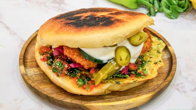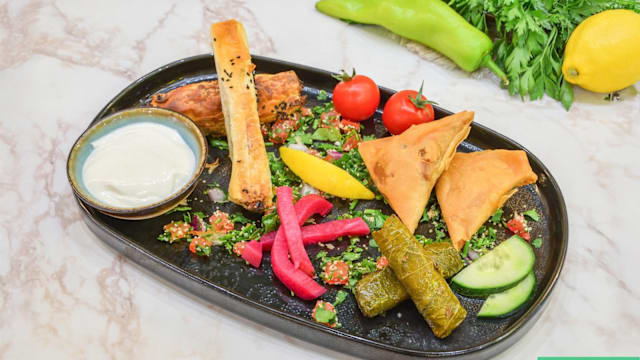 Boeuf mariné 48h, ail, citron et 7 épices, fromage cuit au BBQ, servi avec sauce tahini