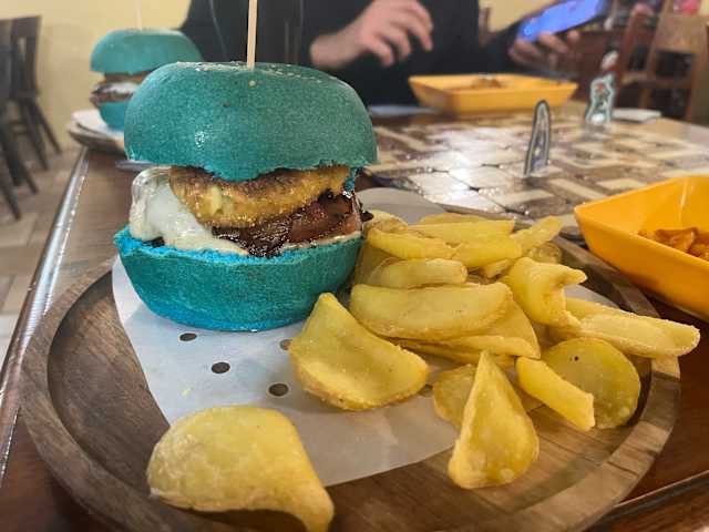 - Pane blu all'alga spirulina, salsa ceasar, cotoletta di pollo, bacon, insalata