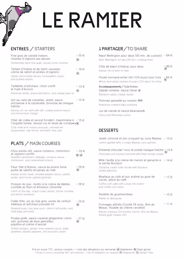 Cher Julen J., Nous sommes ravis de votre expérience au Ramier ! Cette note parfaite de 10/10, nous emplit de joie et nous encourage à maintenir notre niveau d'excellence. Bien que votre avis soit concis, il reflète une satisfaction globale que nous apprécions grandement. Nous aurions aimé connaître plus en détail ce qui vous a plu. Était-ce notre carte créative aux associations originales ? Nos plats signatures élaborés avec soin ? Ou peut-être l'ambiance chaleureuse de notre établissement au cœur de Montparnasse ? Pour vos prochaines visites, n'hésitez pas à explorer davantage notre offre. Outre notre carte gastronomique, nous proposons un menu hebdomadaire plus accessible, des options à partager, ainsi que des plats végétariens et sans gluten. Notre équipe multilingue se fera un plaisir de vous guider dans vos choix. Merci d'avoir pris le temps de partager votre avis. Nous espérons vous accueillir à nouveau pour une expérience culinaire encore plus mémorable ! Cordialement, L'équipe du Ramier