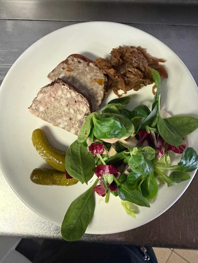 - Terrine de campagne, confiture d'oignon, salade