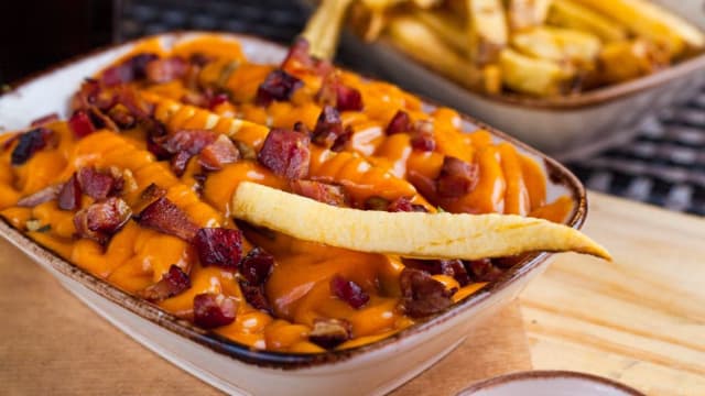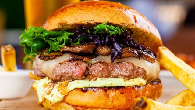 130g de brutos de acém, molho da casa, queijo cheddar, crispy de bacon, cebola caramelizada em compota de frutos vermelhos