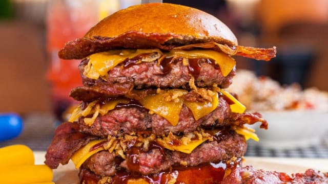 3x de 130g de brutus do acém, queijo cheddar, bacon, cebola frita, molho barbecue