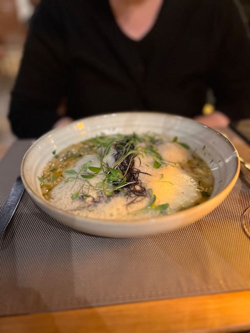 9.5/10The food was fabulous. I loved the gyoza appetizer which was a super creative fusion of food traditions and taste, but the main with Hake, razor neck clams and lemon risotto was to die for. Service was perfect, attentive with helpful suggestions but not hovering. Dining alone can be a hit or miss experience, and this was literally perfect.