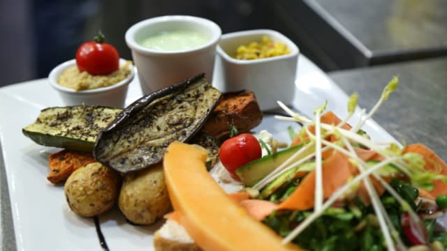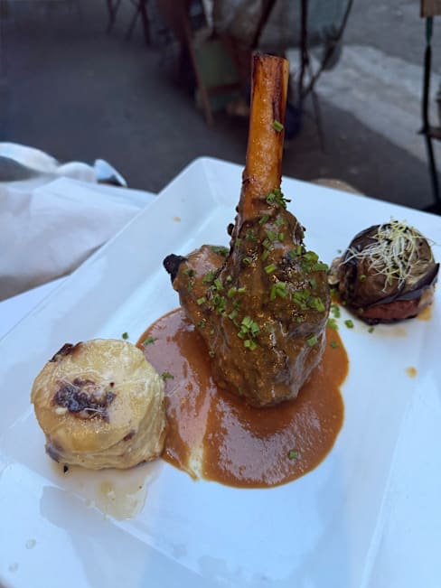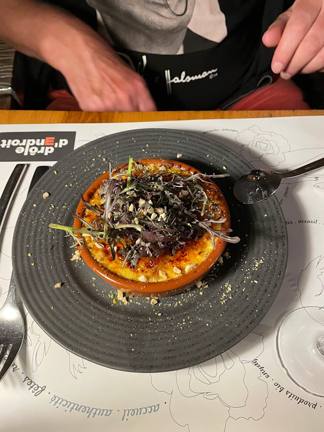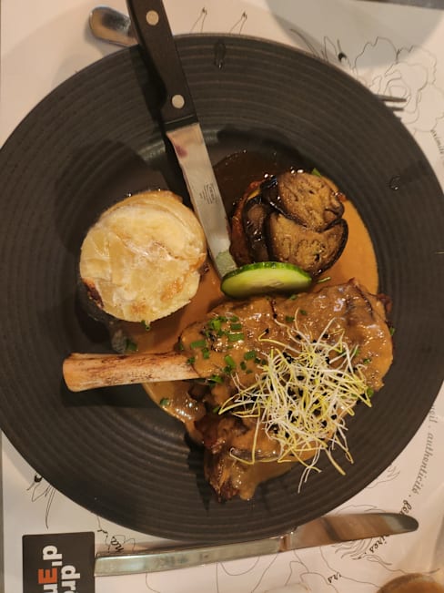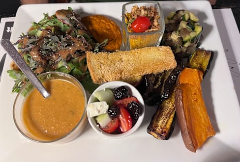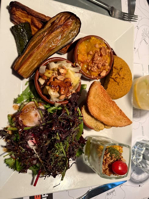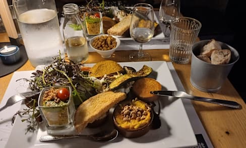 10/10Where do I begin? What an absolute treat it was to be able to eat here during our stay in Aix. Hidden within an unassuming alleyway, you'll find a beautifully decorated, cosy and comfortable restaurant with passionate and charming staff, who clearly care about their customers and food. I believe we were served by the manager, whom I spoke with briefly in French, however English speakers were certainly still welcomed to have the menu explained. We both chose that day's "Assiette Vegetarienne", and a small pitcher of white wine to share. The value for the meal we were served was unbelievably good. A gorgeous platter of individually delicious portions of different vegetarian food, a gallette, a small potage, couscous, hummus, roasted vegetables, salad, everything cooked to perfection, and clearly lovingly put together for the flavours to blend well. I could be called speechless after the meal, but that might just be my lack of knowledge of French superlatives. Incredible experience!