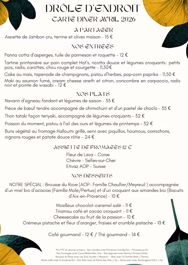Drôle d'EndroitDear Barbara. Thank you so much for your kind words and for taking the time to share your experience. We are truly delighted that you enjoyed the atmosphere, the wines, and the food. Most of all, thank you for your continued loyalty — it always means a lot to welcome you back. Knowing that Drôle d’Endroit remains one of your favorite places in Aix is the best compliment we could receive. We look forward to seeing you again very soon for another delightful evening… and to help you keep that great reputation with your friends!