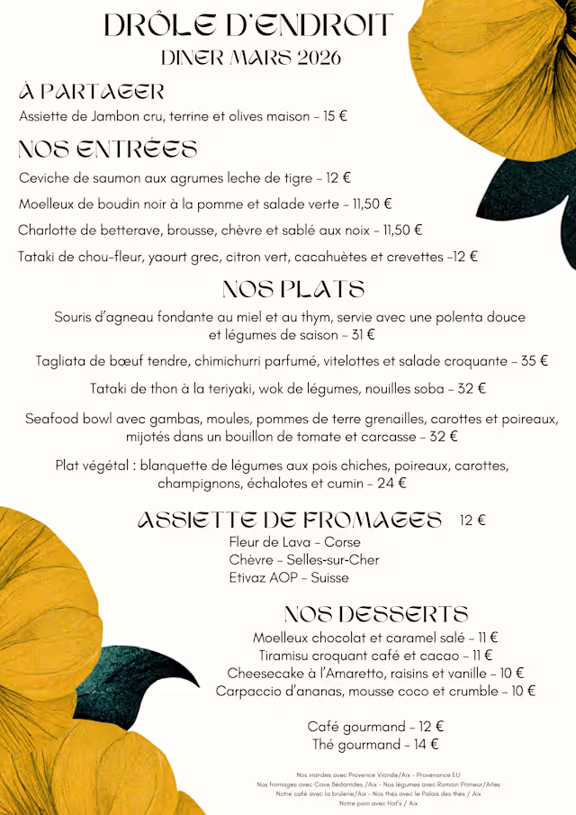 Drôle d'EndroitThank you for taking the time to share your feedback. We are sincerely sorry that your experience did not meet your expectations, particularly regarding your main dish. Our restaurant has been located in this small cul-de-sac for over 15 years, and while it may feel off the main paths, this setting is very much part of its history, character, and originality—something many of our guests appreciate for its quieter, more intimate atmosphere. Our menu may indeed appear limited, with four starters, four mains, and four desserts, but this is a deliberate choice. We cook everything fresh every day, based on market availability and the capacity of our kitchen, in order to ensure quality and consistency rather than volume. We regret that the lamb tagine did not deliver the experience we strive for, and your comment has been shared with the kitchen team. We truly hope you might consider giving