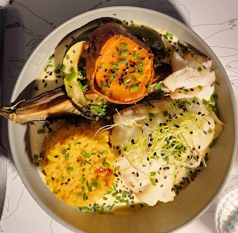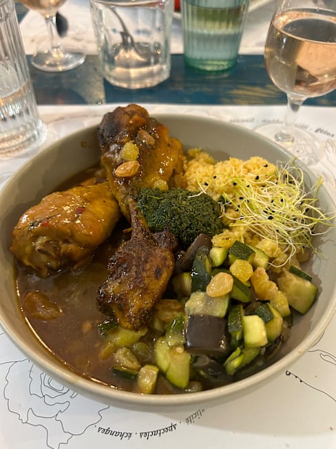 10/10Where do I begin? What an absolute treat it was to be able to eat here during our stay in Aix. Hidden within an unassuming alleyway, you'll find a beautifully decorated, cosy and comfortable restaurant with passionate and charming staff, who clearly care about their customers and food. I believe we were served by the manager, whom I spoke with briefly in French, however English speakers were certainly still welcomed to have the menu explained. We both chose that day's "Assiette Vegetarienne", and a small pitcher of white wine to share. The value for the meal we were served was unbelievably good. A gorgeous platter of individually delicious portions of different vegetarian food, a gallette, a small potage, couscous, hummus, roasted vegetables, salad, everything cooked to perfection, and clearly lovingly put together for the flavours to blend well. I could be called speechless after the meal, but that might just be my lack of knowledge of French superlatives. Incredible experience!