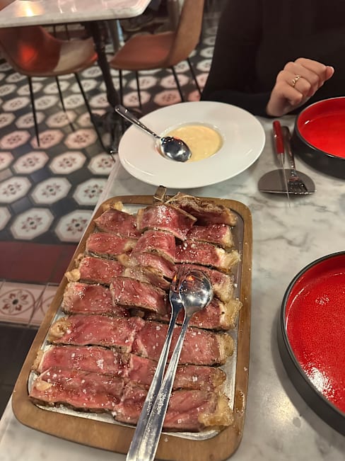 8/10The venue is modern and shiny. The service was smooth. S tarter tartar was great. Sadly my main course was overcooked what was disappointing, since the meat was sliced and the wrong result (medium + instead of requested medium -) was clearly seen. Portion was changed. Caponata side order was too sweet and other sides mediocre. Drink list for aperitif's is limited.