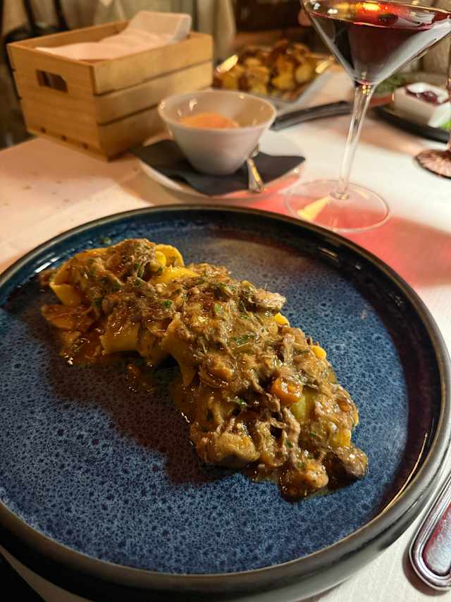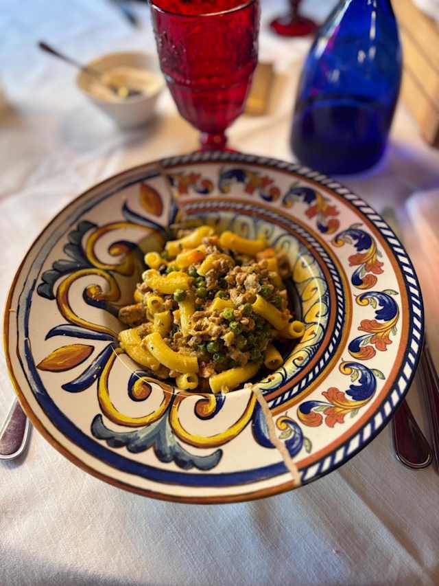 Pasta fresca di nostra produzione con ragù bianco di gallina grisa, piselli e zest di arancia