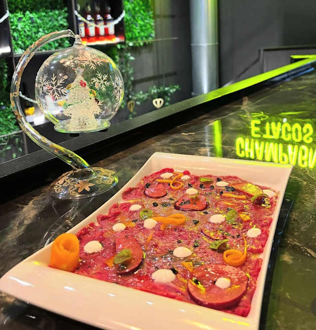 - Tacos con tartare di manzo con majo al jalapeno e crema di olive nere