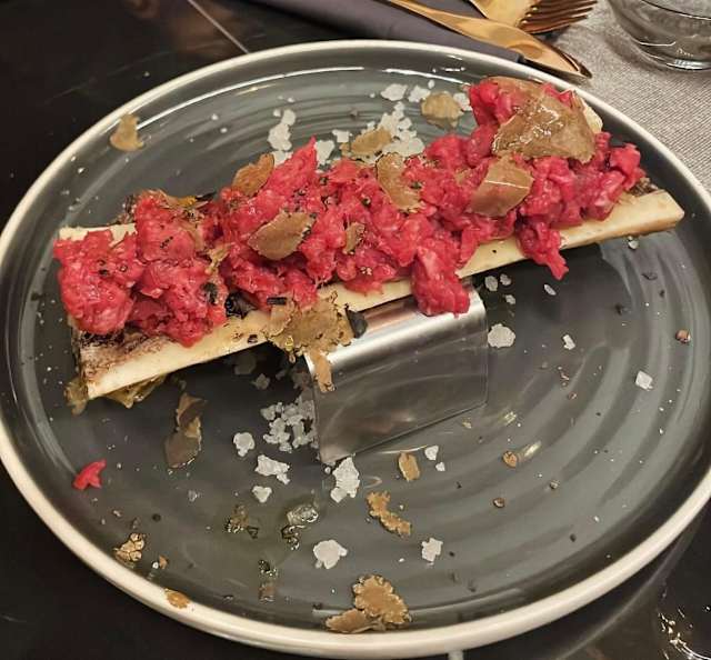 - Tartare di manzo su midollo al forno e tartufo uncinato fresco
