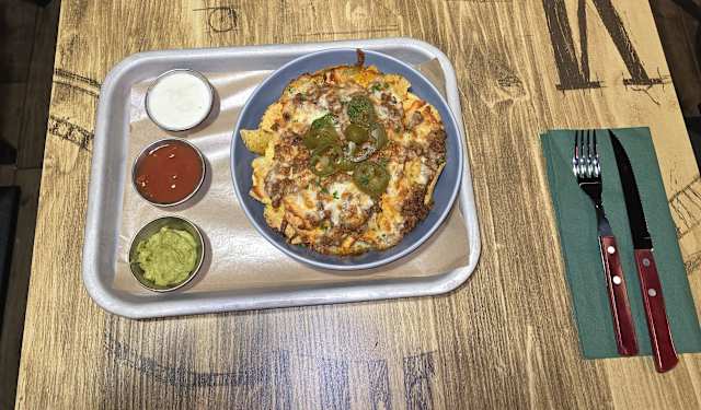 - Nötfärs, gräddfil, salsa, guacamole, jalapeño & gratinerad med ost