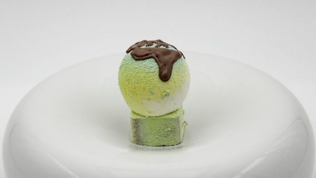 Panella di ceci, con pesto di erbette, insalatina di porcini, ghiacciato al pinolo salato vegetariano
