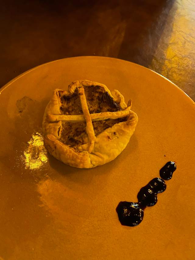 - Due strati di pasta sfoglia al miele ripieni di pere, frutta secca, miele e spezie