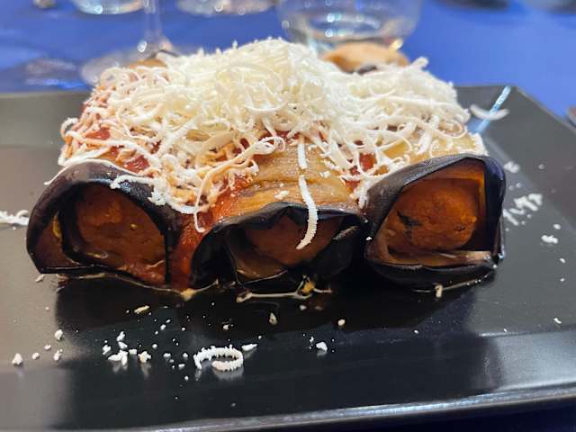 - Timballo di melanzane in pasta filo con salsa di datterino parmigiano vacche rosse mortadella artigianale di forsa d' Agró