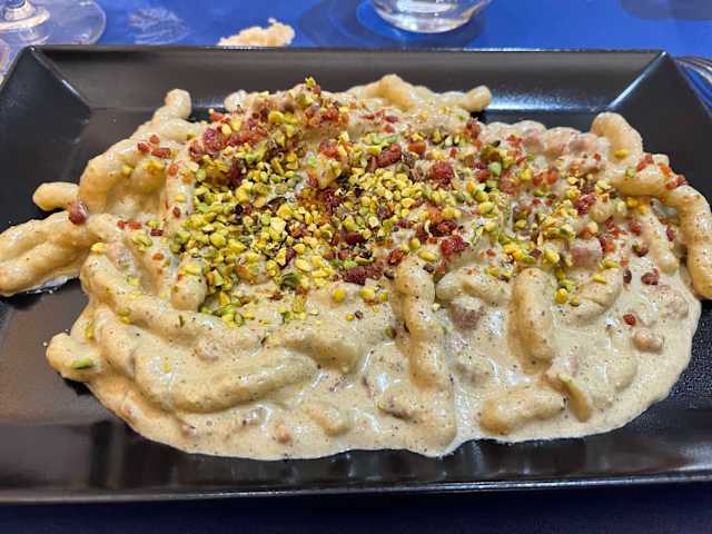 - Caserecci di pasta fresca con pesce spada, mentuccia, melanzane, e crema di stracciatella
