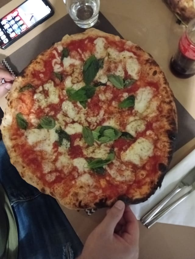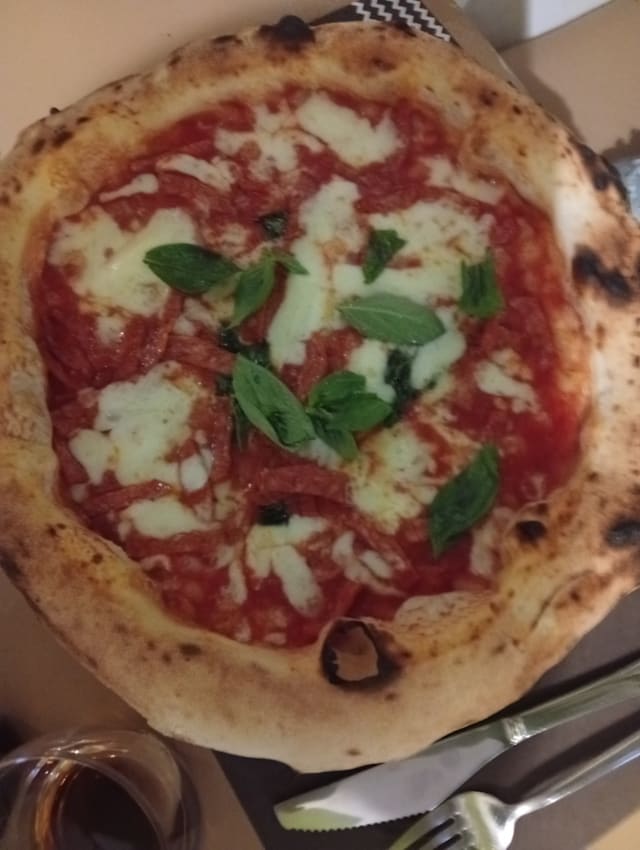 Pomodoro san marzano DOP, mozzarella misto bufala, salame piccante, basilico, olio extravergine di oliva oro di caiazzo.