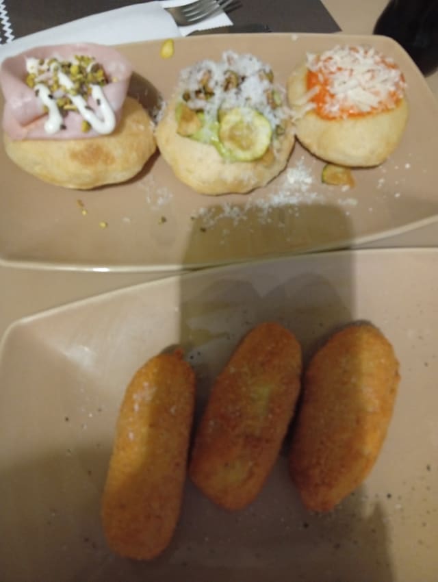 Montanarina classica: ragù di san marzano dop e scaglie di parmigiano reggiano dop, montanarina golosona: mortadella favola, granella di pistacchio, mousse di parmigiano reggiano dop, motanarina nerano: vellutata di zucchine, chips di zucchine, provolone del monaco.
